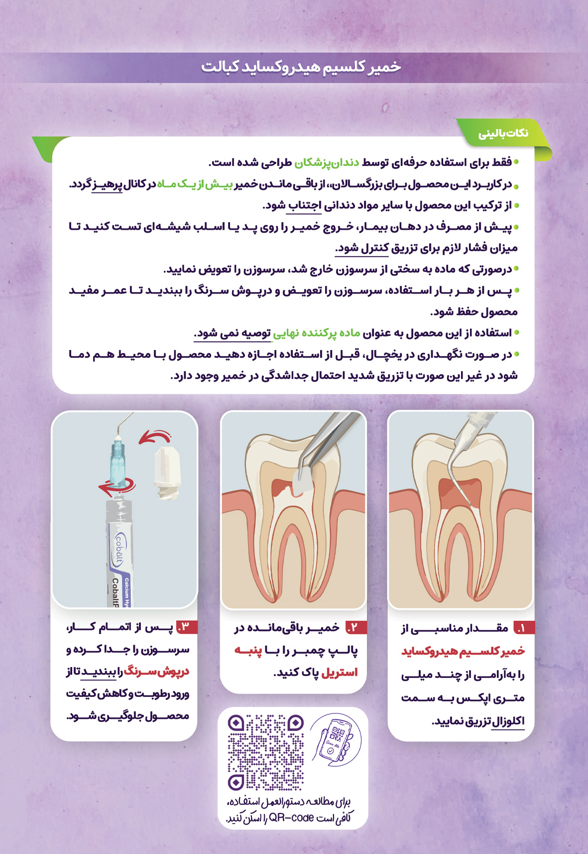- Cobalt Paste یک خمیر کلسیم هیدروکساید از پیش مخلوط شده حاوی باریوم سولفات است. این محصول عاری از یدوفرم بوده، در آب محلول است و به سادگی میتوان آن را از محیط کانال حذف نمود. علاوه بر این Cobalt Paste رادیواپک و آنتی باکتریال بوده، در مجاورت آب به pH 12 می رسد و با ویسکوزیتی مناسب توانایی تزریق به کانال ریشه و پوشاندن کانالهای فرعی را به دندان پزشک می دهد. سری تزریق یکبار مصرف پلاستیکی این محصول امکان تزریق راحت آن را به فضای کانال ریشه فراهم کرده است.