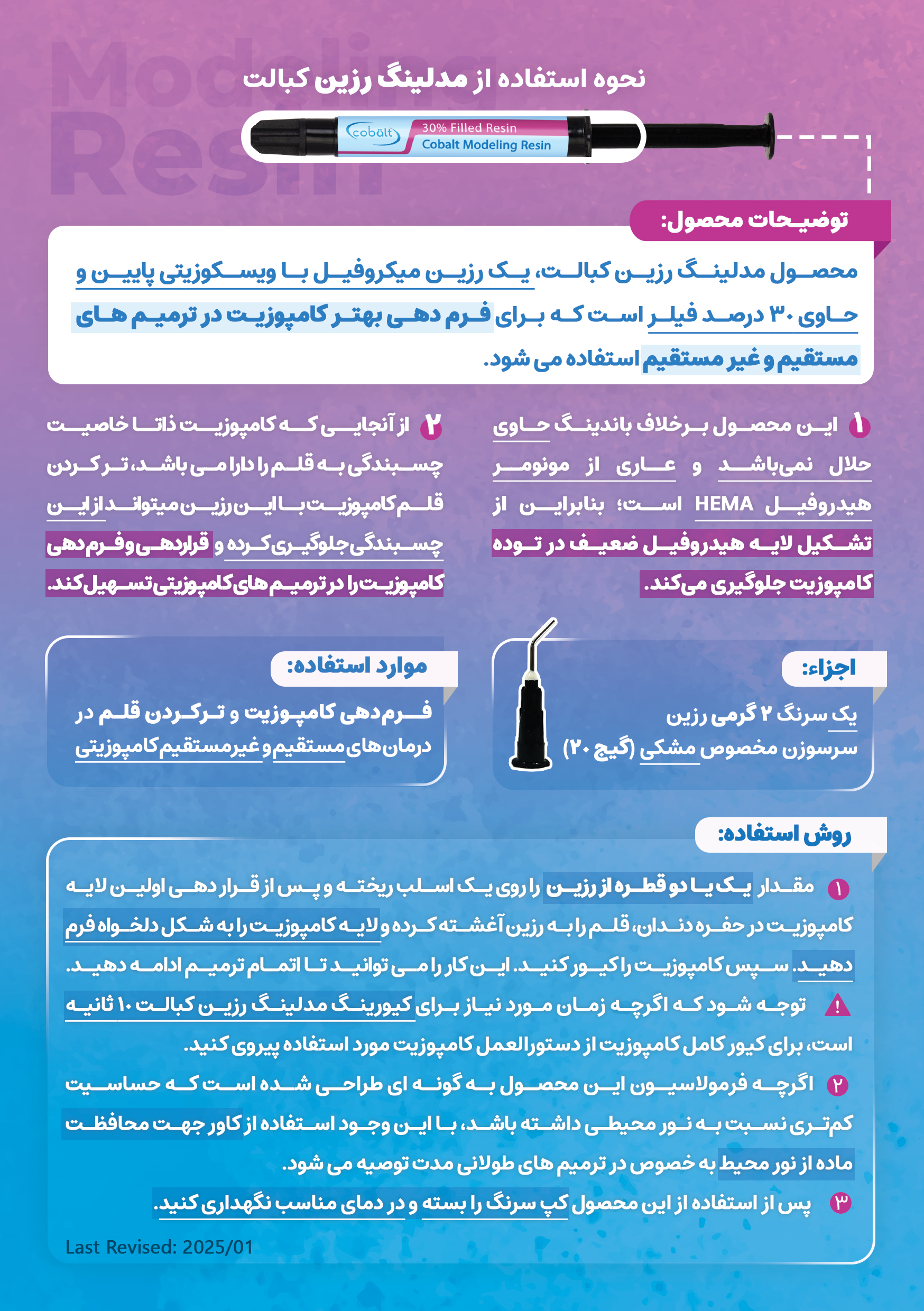 - محصول مدلینگ رزین کبالت، یک رزین میکروفیل با ویسکوزیتی پایین و حاوی 30 درصد فیلر است که برای فرم دهی بهتر کامپوزیت در ترمیم های مستقیم و غیر مستقیم استفاده می شود.