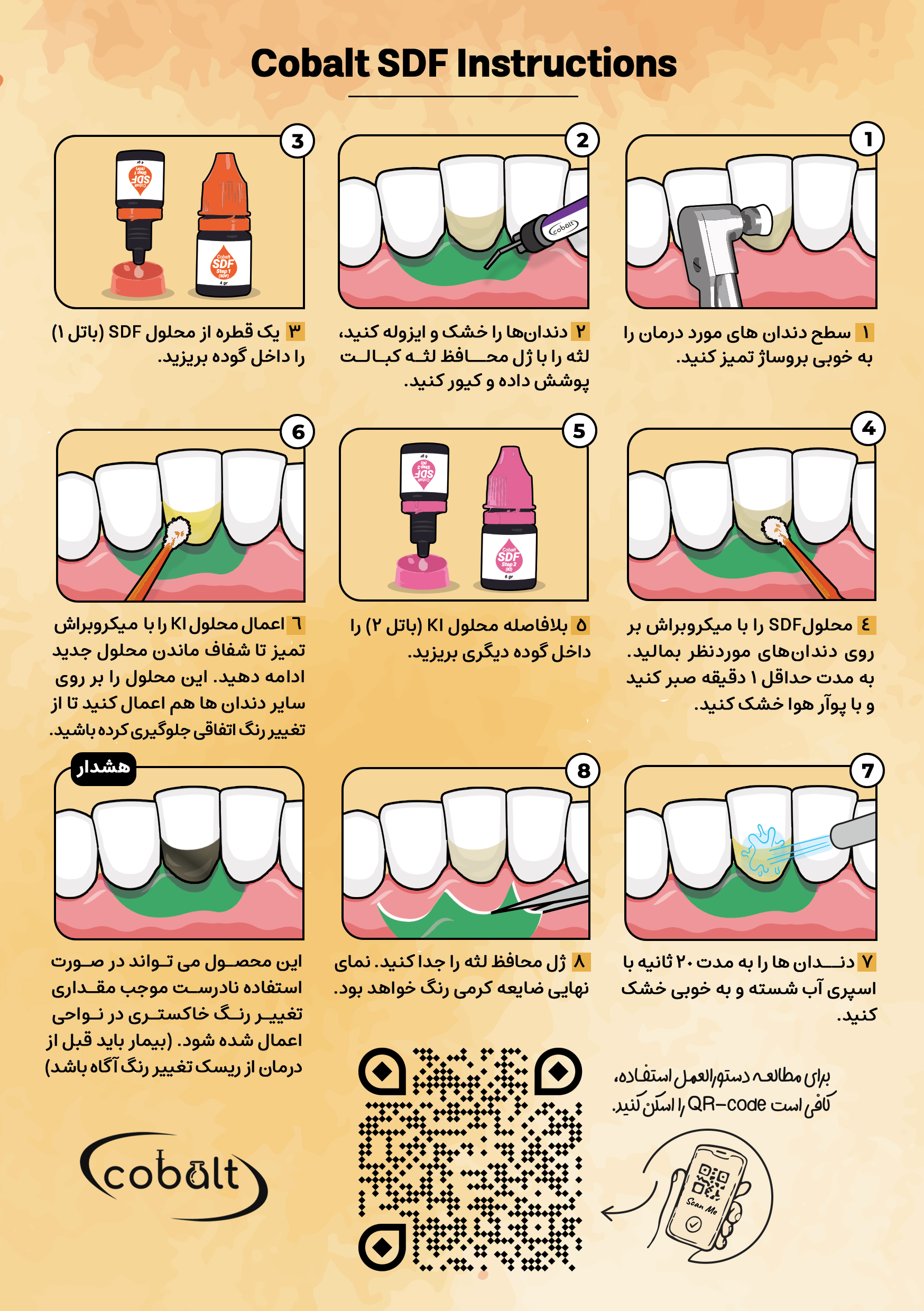 - SDF کبالت ماده ای حاوی نقره و فلوراید است که به عنوان عامل ضد حساسیت در پوسیدگی های عاجی استفاده می شود. این محصول همچنین می تواند به عنوان متوقف کننده پوسیدگی های شدیدا پیش رونده (rampant caries) استفاده شود.