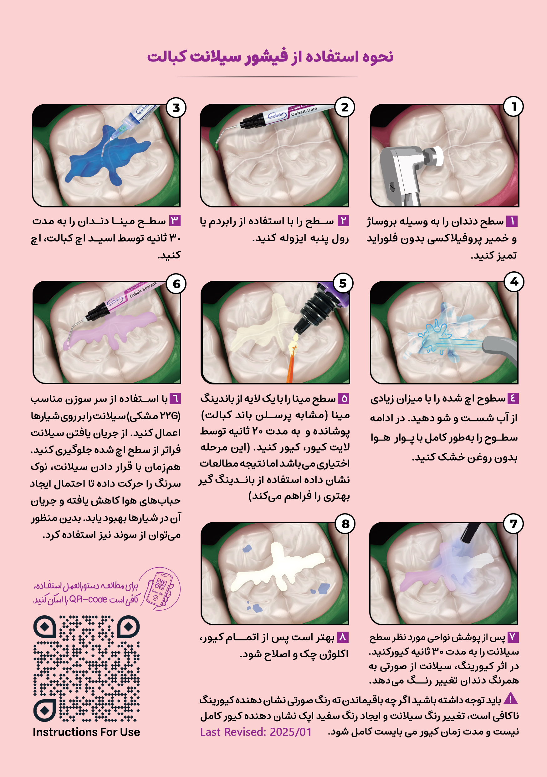 – فشور سیلانت کبالت یک محصول کاملا هیدروفوب است و برای قرار گیری و اتصال به مینای دندان نیاز به ایزولیشن کامل دندان دارد لذا دندان بایستی به طور کامل رویش یافته باشد تا از آلودگی محیط کار با بزاق پیشگیری شود.